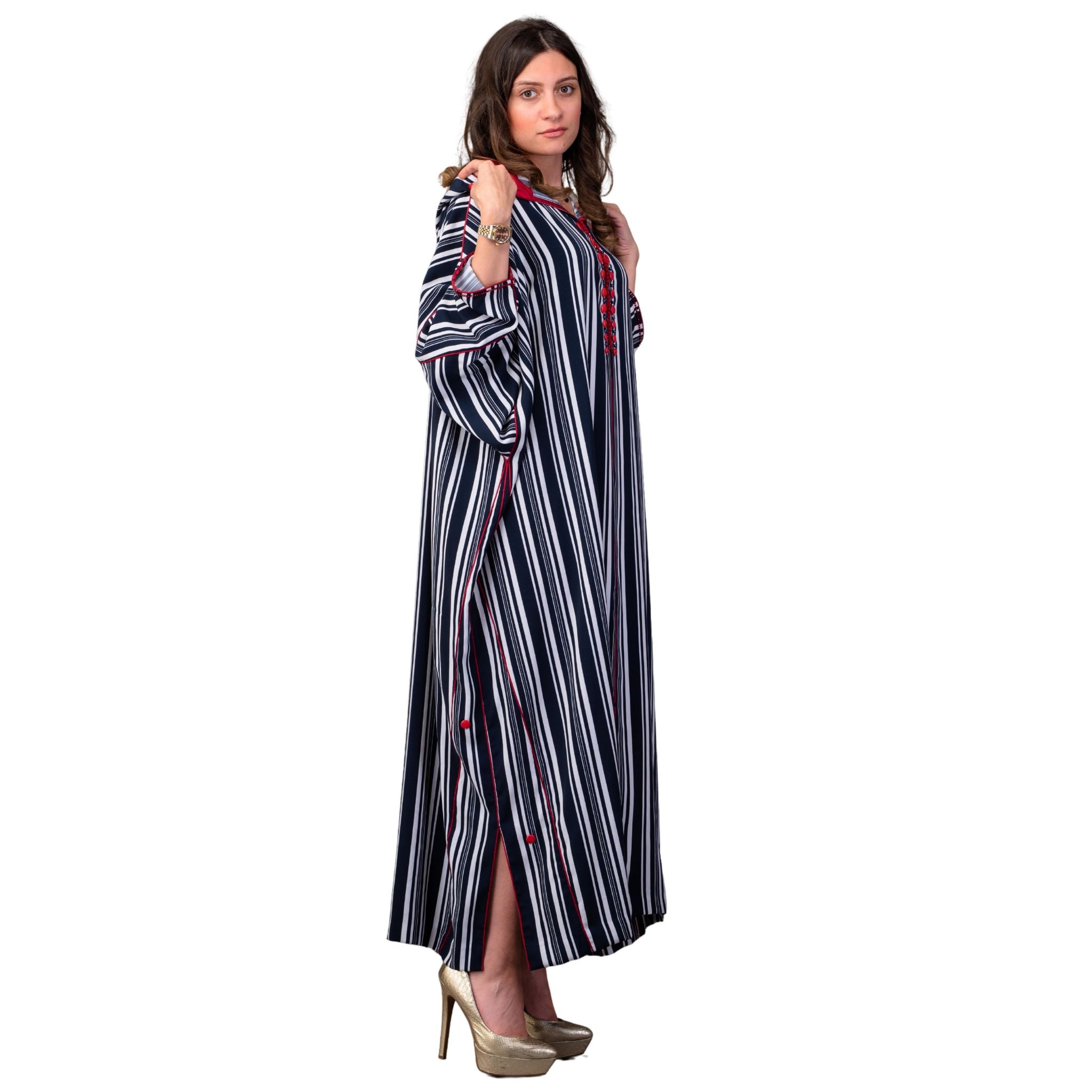 هنا الجلابة الجميلة لدينا أسود مع خطوط بيضاء. هذا الثوب المغربي التقليدي مصنوع يدويًا بشكل فاخر كريب الحرير و مطرزة باليد بخيط أحمر المعلم. و مزينة بالأحجار الكريمة. إنها الطريقة المثالية للبقاء هادئًا ومرتاحًا خلال الأشهر الأكثر دفئًا. سواء كنت تحتفل رمضان 2022 أو كنت ترغب فقط في إضافة لمسة من الطراز المغربي إلى خزانة ملابسك ، فهذا الجلابة مثالي لك